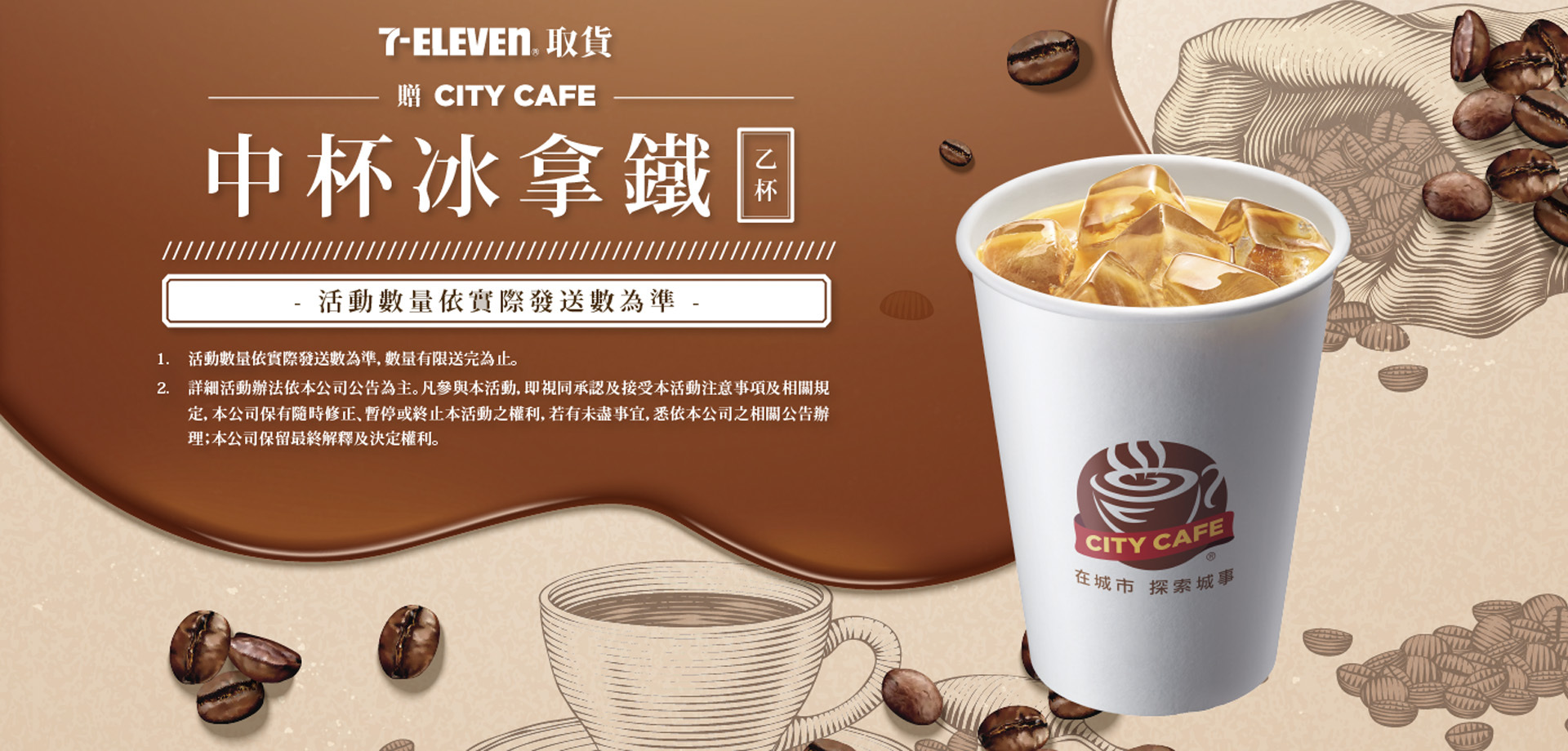 2.憑紙本咖啡兌換券至櫃檯,即可換得 CITY CAFE 中杯冰拿鐵 乙杯。